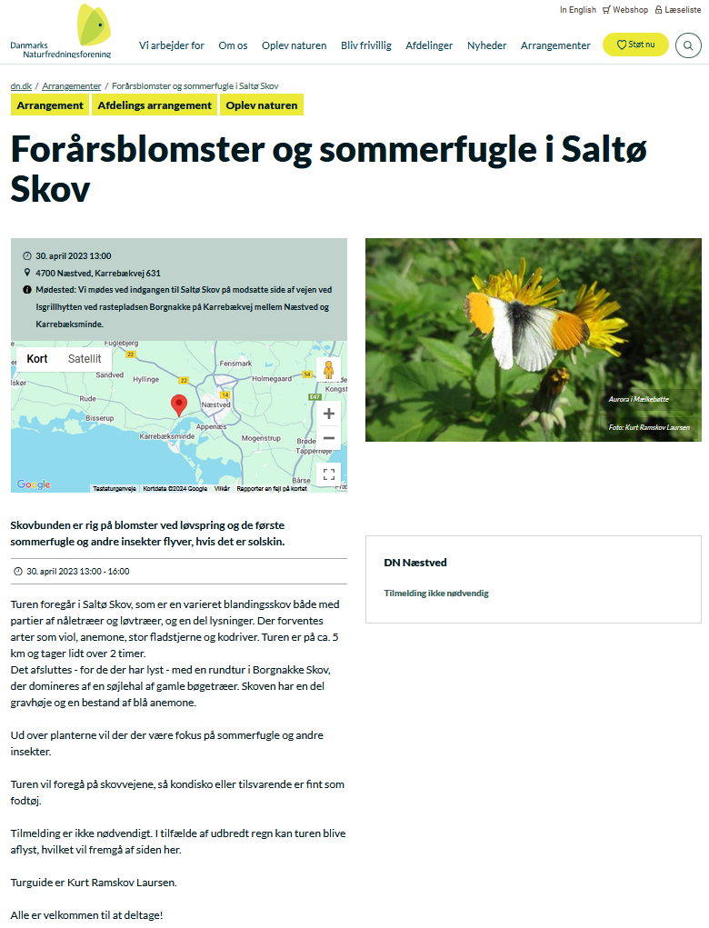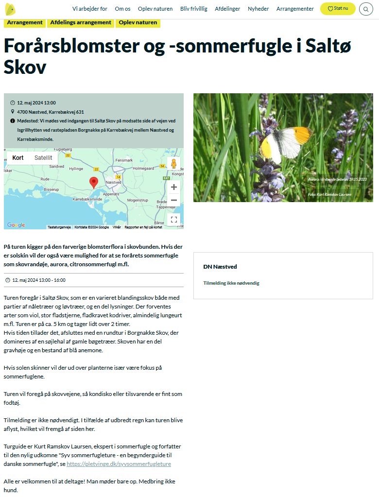 Kom og oplev forårets sommerfugle i skoven, bl.a. aurora, nældesommerfugl og sømplet. Hvis det er solskin vil hovedfokus være på sommerfuglene og ellers på de mange forårsblomster. Turen kræver ingen forhåndsviden om sommerfugle eller planter.