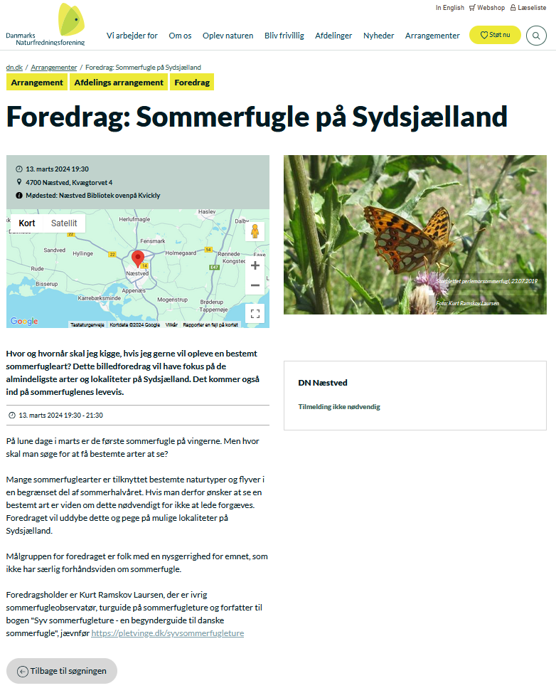 Billedforedrag på Næstved Bibliotek om de almindelige sommerfuglearter på Sydsjælland, samt hvor og hvornår man kan finde dem.